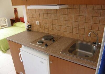 Атрактивна вила која се наоѓа во мирна улица, споредно од главната, која е поврзана со центарот и плажата. Оддалечена е околу 400 метри од преубавата песочна плажа Скала. Студио 02, 03: просторни, комфорни соби со два стандардни кревети или француски кревет со трет кревет, издвоена кујна ( фрижидер, вграден шпорет со две рингли, прибор и садови според бројот на гостите), клима ( со доплата ), купатило-туш/тоалет. Тераса со гарнитура за седење. Апартман 04 го сочинуваат две спални соби со еден француски кревет и два одвоени кревети и има простор за дневен престој со кујнски дел и купатило како во студијата.