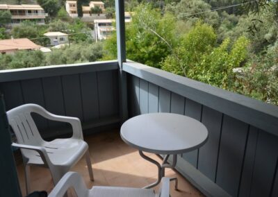 Собата има еден брачен кревет со широчина 130 cm и еден единечен кревет со широчина 80 cm, клима, плакар и огледало. Кујна нема, но има мини фрижидер со комара за замрзнување мијалник со чешма. Тоалетот е со туш кадичка за стоење. Прозорот има дрвена ролетна и завеса. Балконот е со средна големина со маса и столици (соодветен број на сместувачкиот капацитет во студиото).