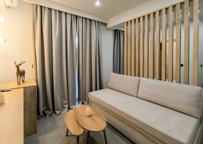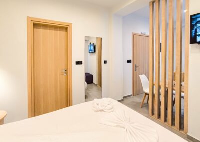 Студио број 4 нуди сместување за 3 лица. Студиото располага со еден брачен кревет и еден кревет на извлекување.
