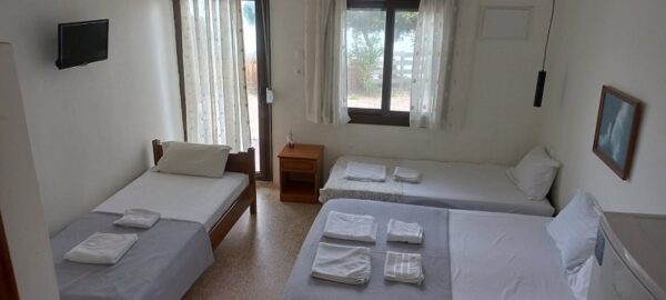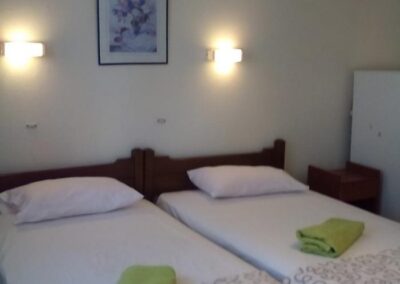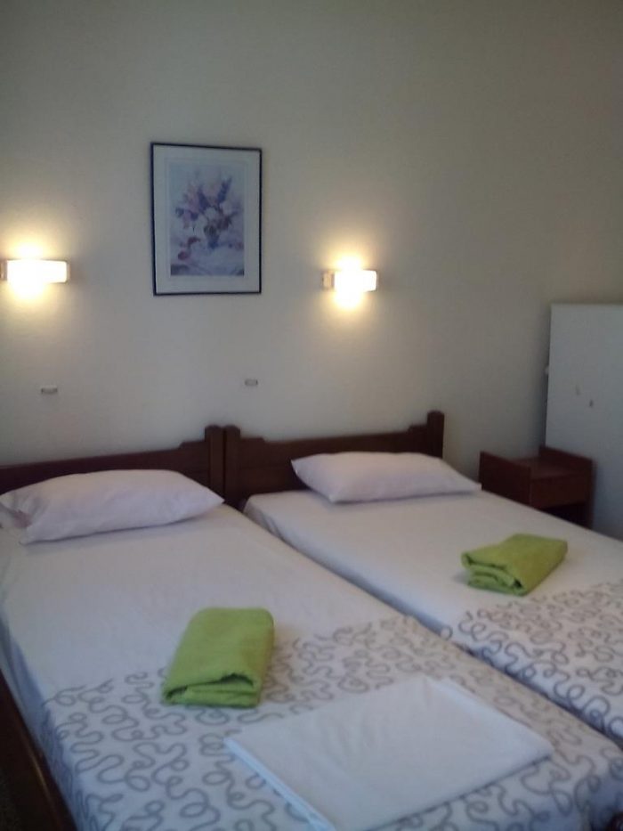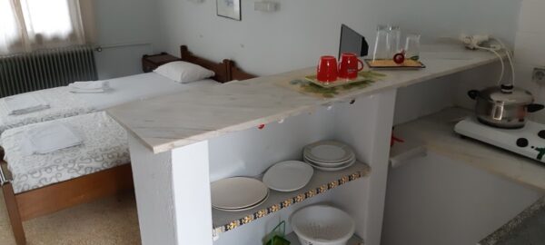 Студиото располага со три поединечни кревети, мини кујна со садови, решо, голем фрижидер, тв,клима уред, мало и тесно вц со туш. Има можност за дополнително креветче за дете до 03 години. Има директен поглед на море.