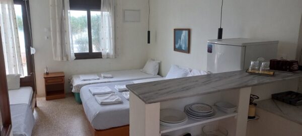 Студиото располага со еден дупол кревет и два поединечни кревети, мини кујна со садови, решо, голем фрижидер, тв, клима уред, мало и тесно вц со туш. Има директен поглед на море.