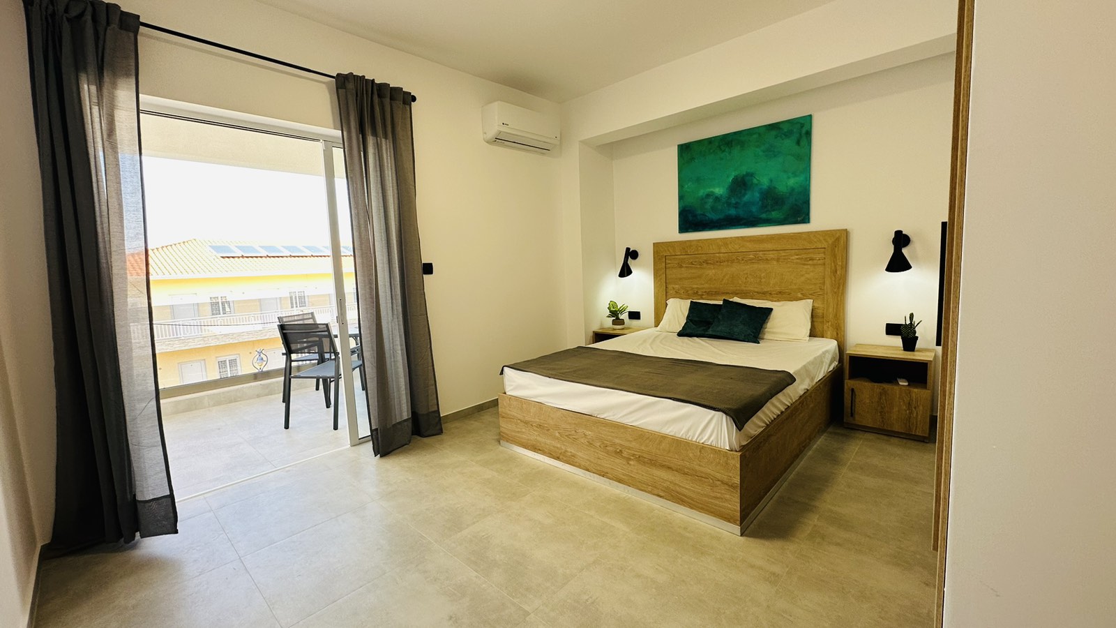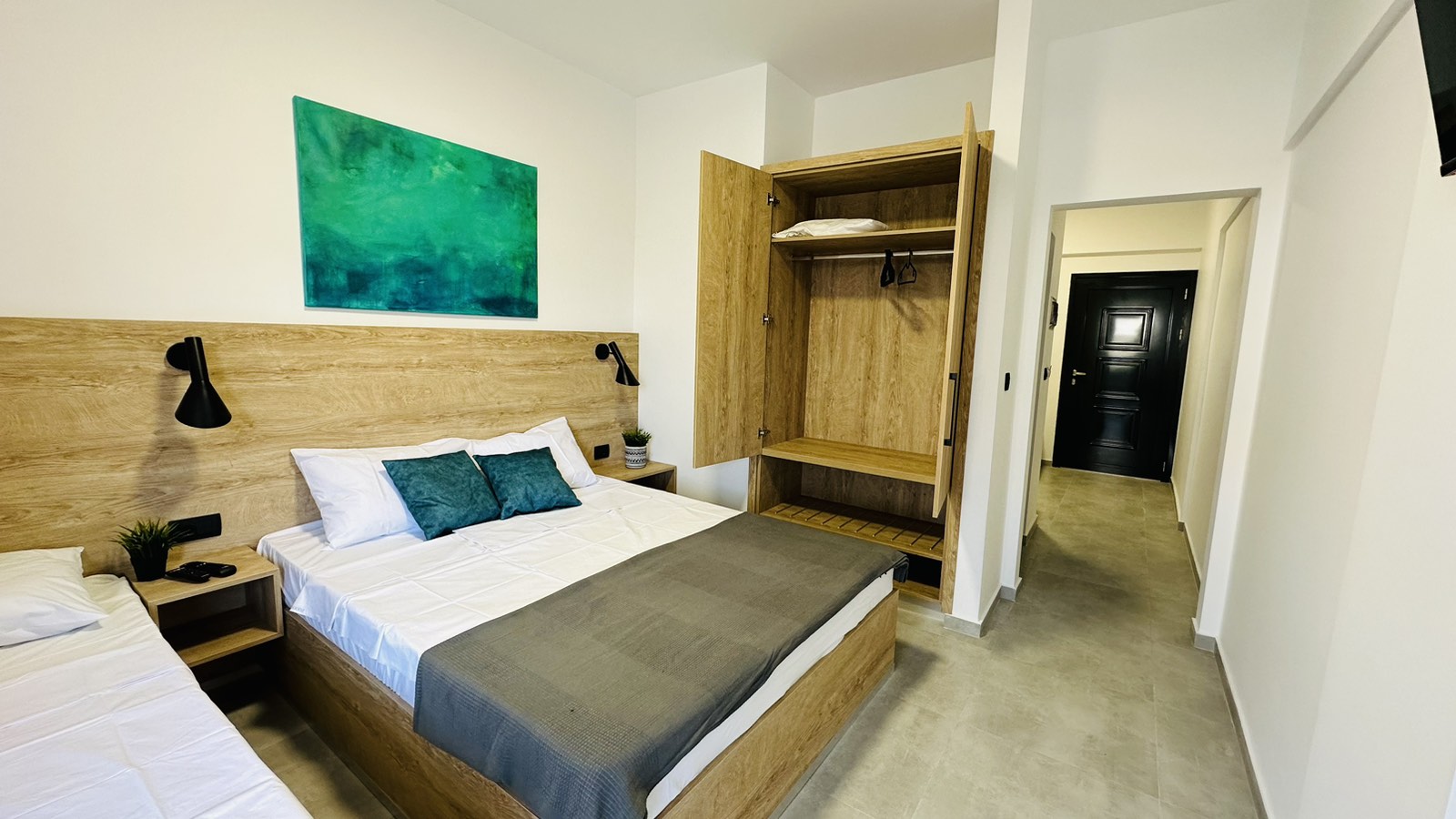 • АПП 1/3+1– еден брачен кревет и еден единечен кревет во посебна соба, опремена кујна со  дополнително легло (кревет на спуштање), ТВ, бања, тераса.
