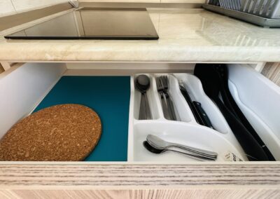• АПП 1/3+2– еден брачен кревет и еден единечен кревет во посебна соба, опремена кујна со дополнителни легла (фотелја на спуштање и кауч (должина 160cm), ТВ, бања, тераса.