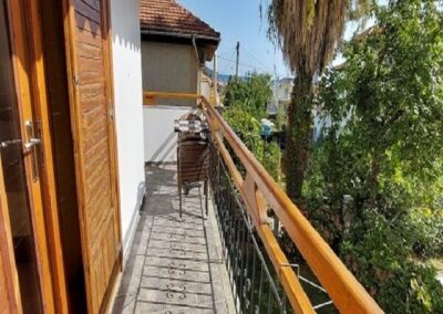 - АПАРТМАН БР.2 (1/2) + (1/2)Апартманот се наоѓа на први кат и располага со две простории.Во првата просторија е кујната која е комплетно опремена со кујнски инвентар,мал фрижидер,шпорет со две рингли ,аспиратор,микробранова печка,чајник и има кревет на извлекување наменет за спиење на 2 лица.Овде има плакар за алишта и клима уред.Од кујната се излегува на тераса со поглед во убав двор полн со зеленило.Втората просторија е спланата соба во која има еден дупли кревет комотен за спиење на две лица, тв и сеф за лични работи.И од спалната соба се излегува на тераса со поглед во убав двор со зеленило. Апартманот располага со стандардно купатило и WC со фен за коса.