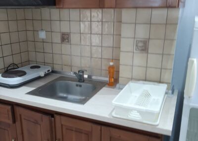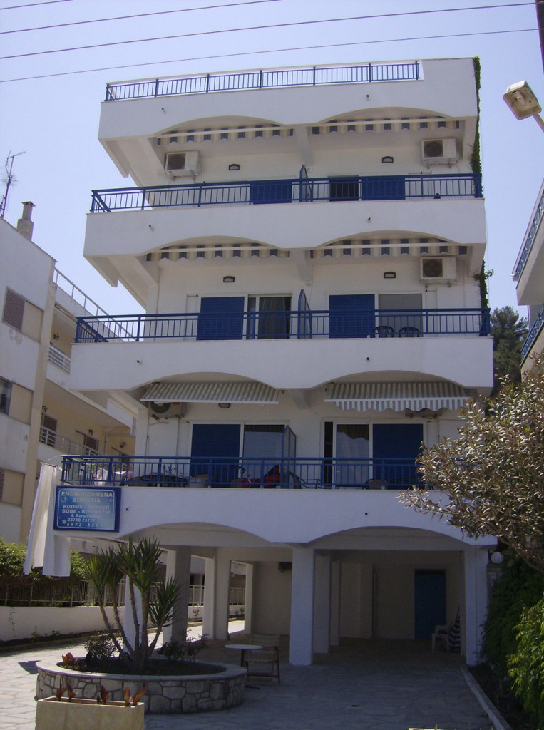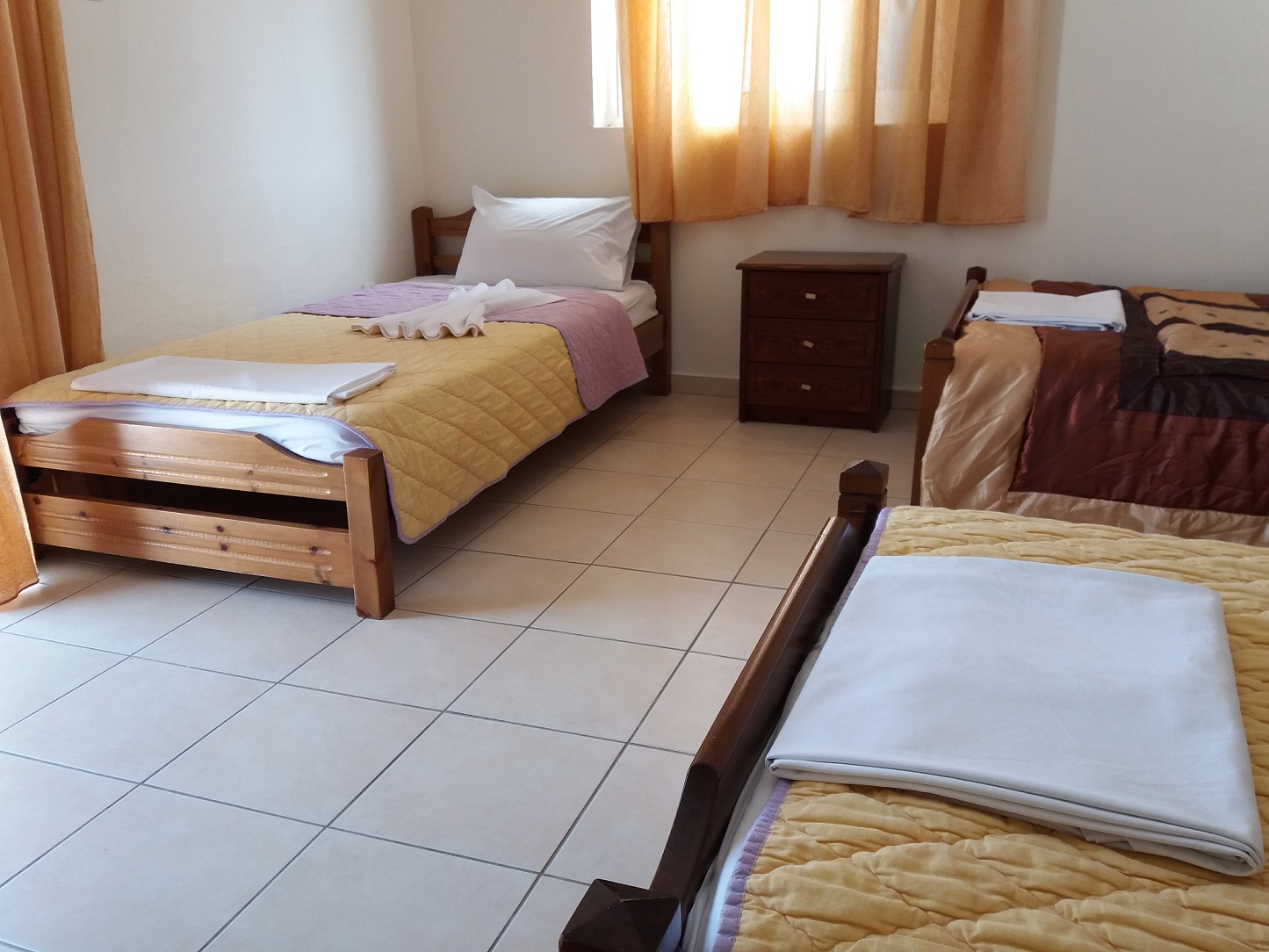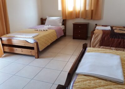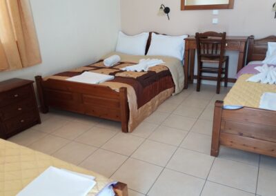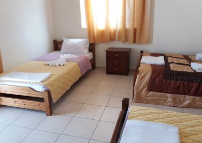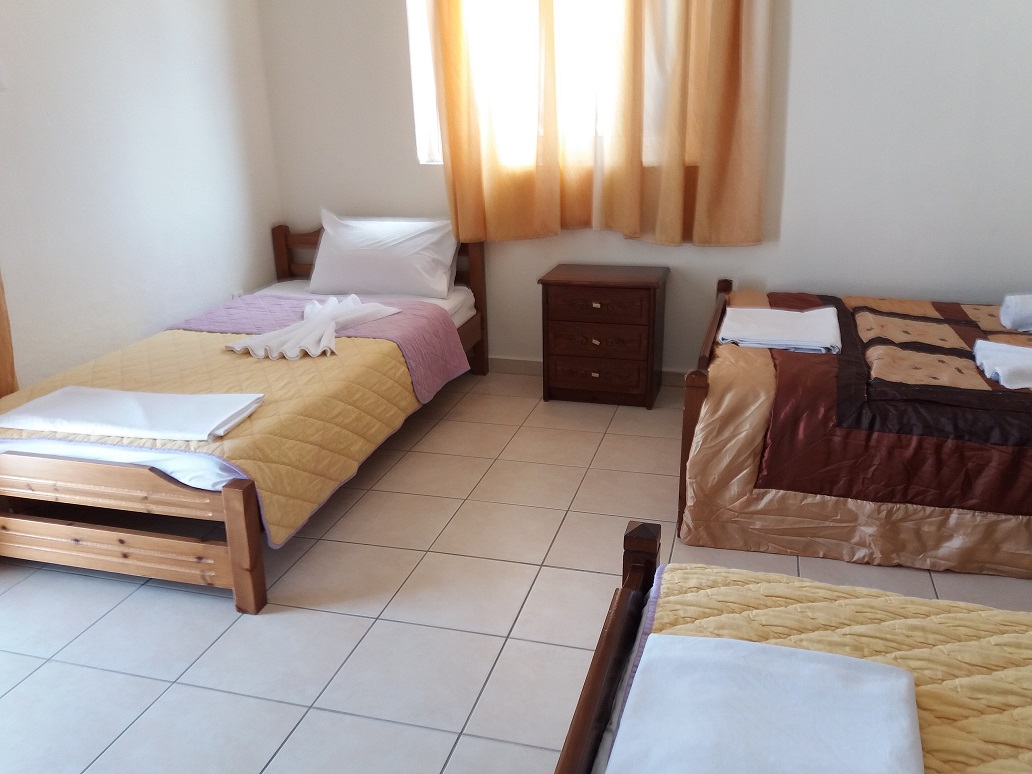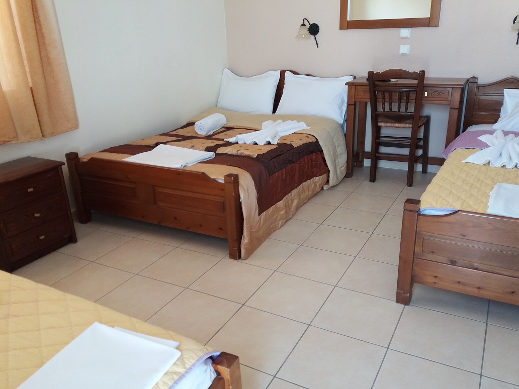 Четворокреветните студија располагаат со брачен кревет за две лица, по грчки мерки т.е потесни од стандардните спални и две единечни стандардни легла, или две дупли потесни легла во собите кој гледаат према градина, мини кујна со прибор за готвење и јадење, сопствен тоалет, балкон, wi-fi. Користењето на клима уредот е вклучено во цената. Истите можат да бидат лоцирани на приземје (без оградена тераса) на втор кат со страничен поглед на море, и две студија со поглед на градина кое се наоѓаат на втор кат. Капацитетот на собите е максимум 4 лица. Надвор од овој капацитет може да се смести само дете до 3,99год.