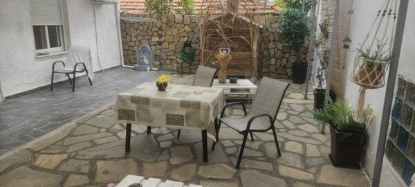 Апартманот се наоѓа на приземје и располага со две простории.Во првата просторија е кујната која е основно опремена со кујнски инвентар за лесни оброци без пржење,голем фрижидер,ел.шпорет со фурна, аспиратор,чајник и има кревет на спуштање наменет за спиење на 1 возрасен+1 дете.Втората просторија е спланата соба во која има еден дупли кревет комотен за спиење на две лица, тв, плакар за алишта и клима уред.Од апартманот се излегува на сопствен двор декоративно среден со маса и столици и полн со зеленило.Апартманот располага со стандардно купатило и WC.