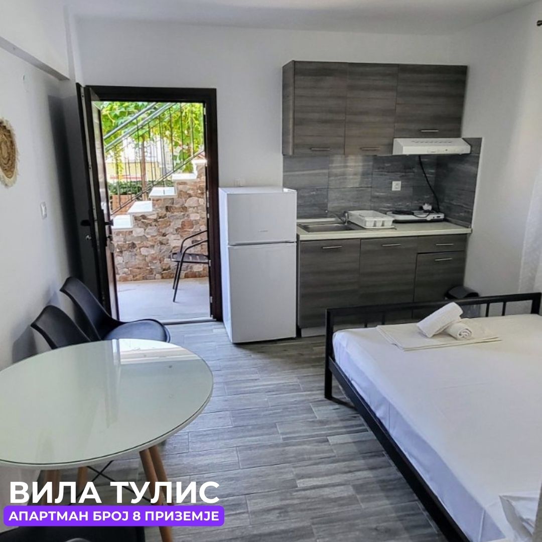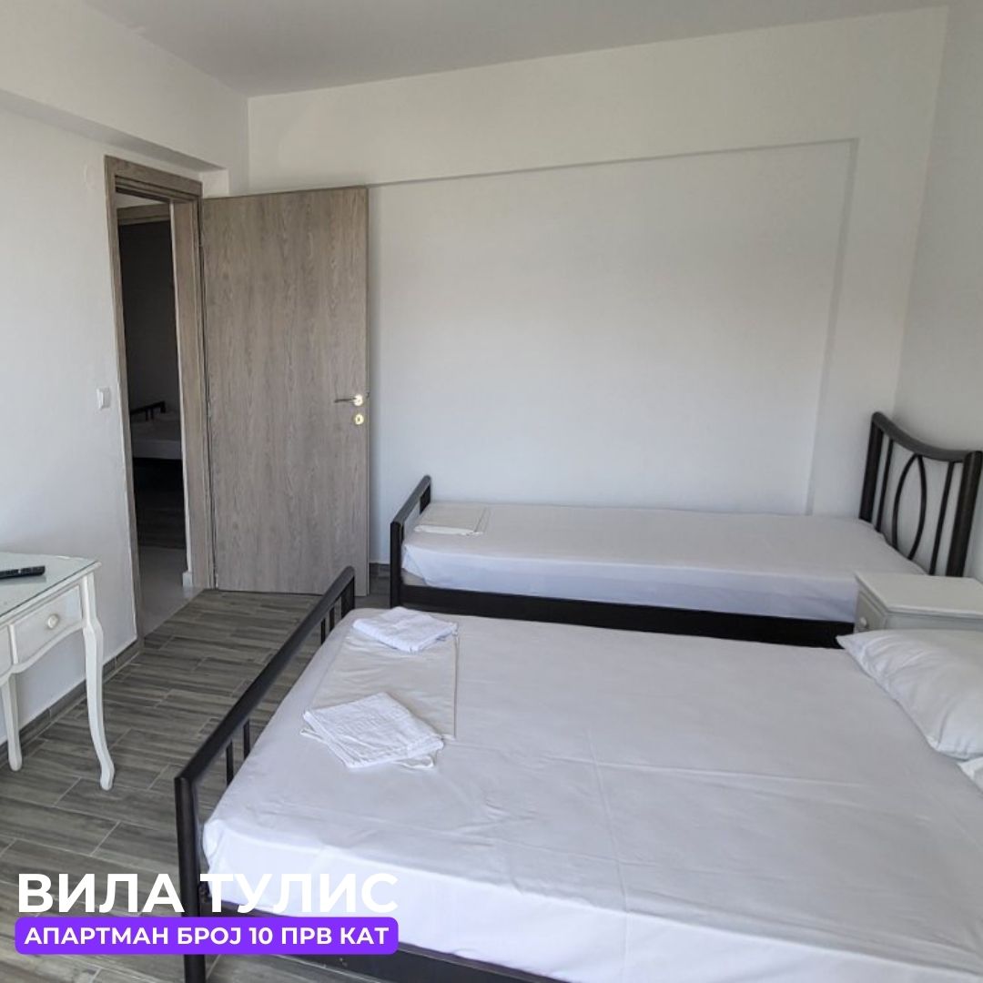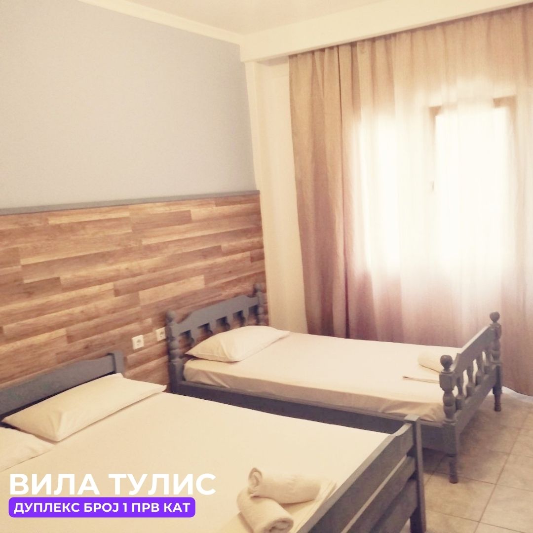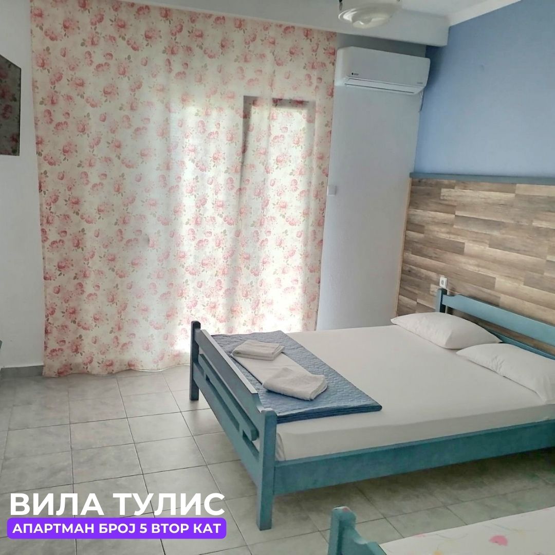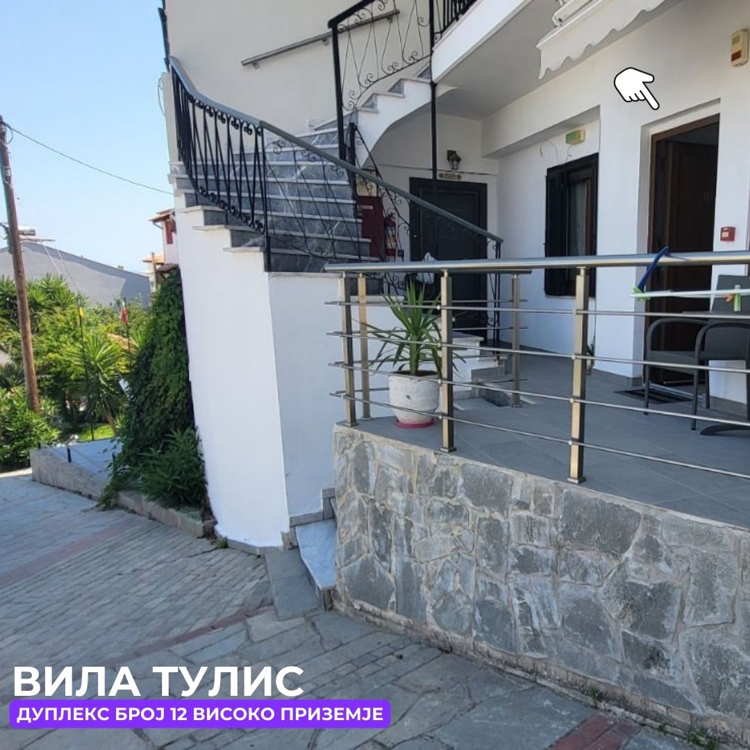 Вила Тулис (целосно реновирана) се наоѓа на 300 метри од плажа во самиот  центар на Полихроно, веднаш над црквата. Вилата располага со апартмани за три, четири и дуплекс апартмани за пет лица, комплетно опремени со кујна, тоалет и тераса. За секој апартман има обезбедено приватен бесплатен паркинг, заеднички двор за дружење на гостите, иралиште за кошарка и приватна теретана. Одличен избор за семејства. Сите апартмани се опремени со клима уред чие користење се доплаќа 35 евра за 7 ноќевања на лице место кај газдите на вилата.